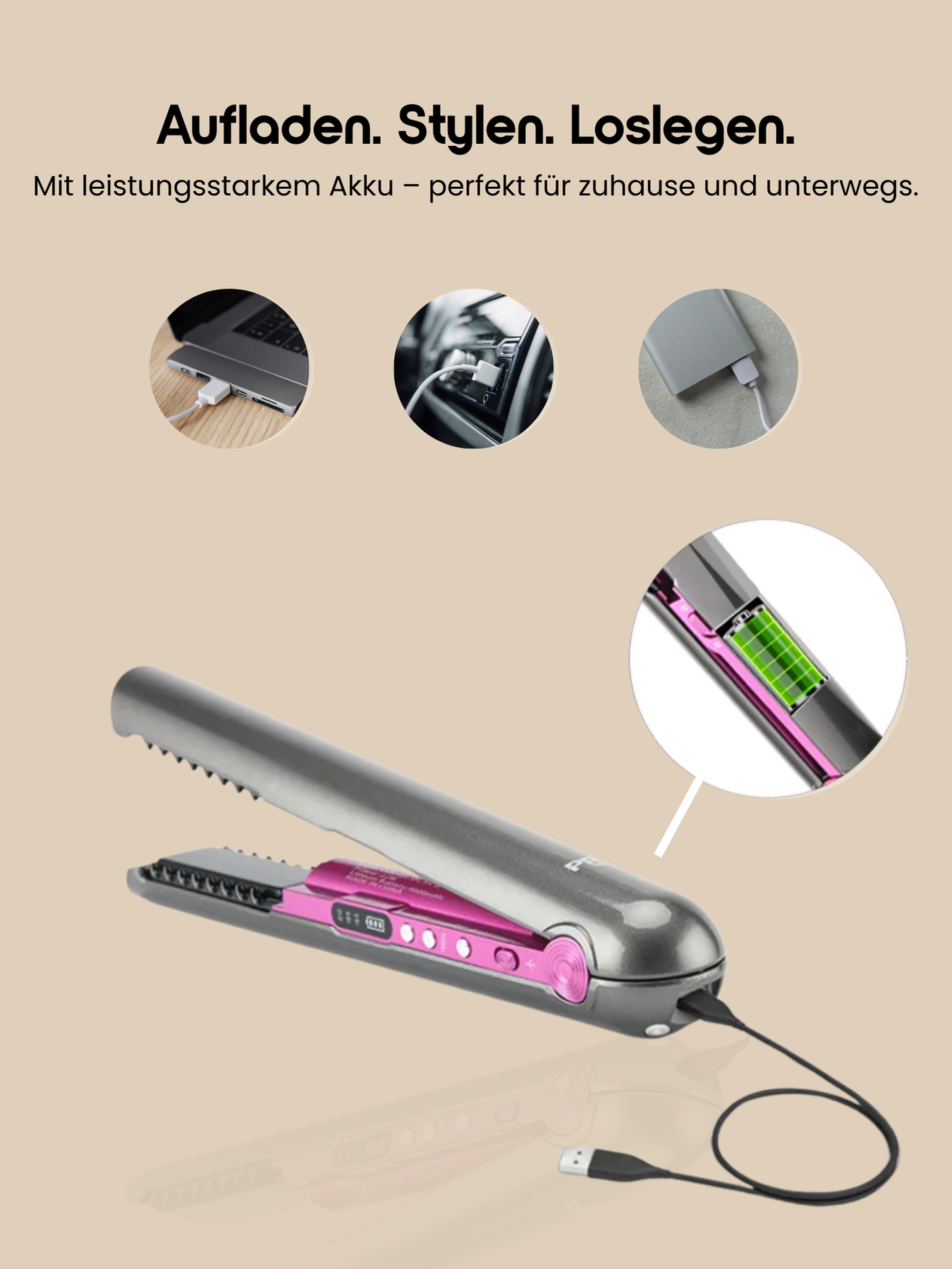 In nur 60 Sekunden einsatzbereit, mit bis zu 45 Minuten Akkulaufzeit – das kabellose Glätteisen passt sich deinem Alltag an. Ob unterwegs oder zu Hause: Durch den integrierten USB-Anschluss lässt es sich jederzeit und überall aufladen – ganz einfach über Laptop, Powerbank oder Adapter.